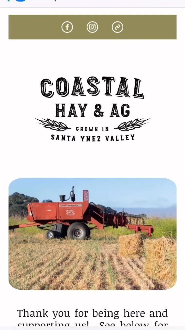 COASTAL OAT HAY: Our coastal oat hay is cut between the milk and dough stage with green color in the stems. It is not irrigated to ensure a high grain to stem ratio, providing excellent quality feed with a low level of waste, do to sweetness in the stems. This hay provides good carbohydrate content along with a minimum of 7% protein. Oat hay is the most affordable forage that we grow.